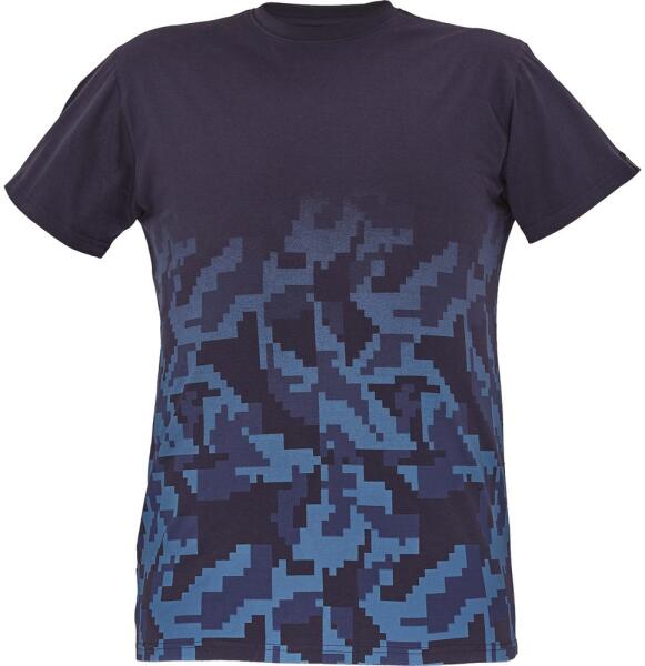 Stílusos, rövid ujjú férfi póló modern geometriai terepmintával. A rugalmas nyakpánt kényelmes viseletet biztosít.